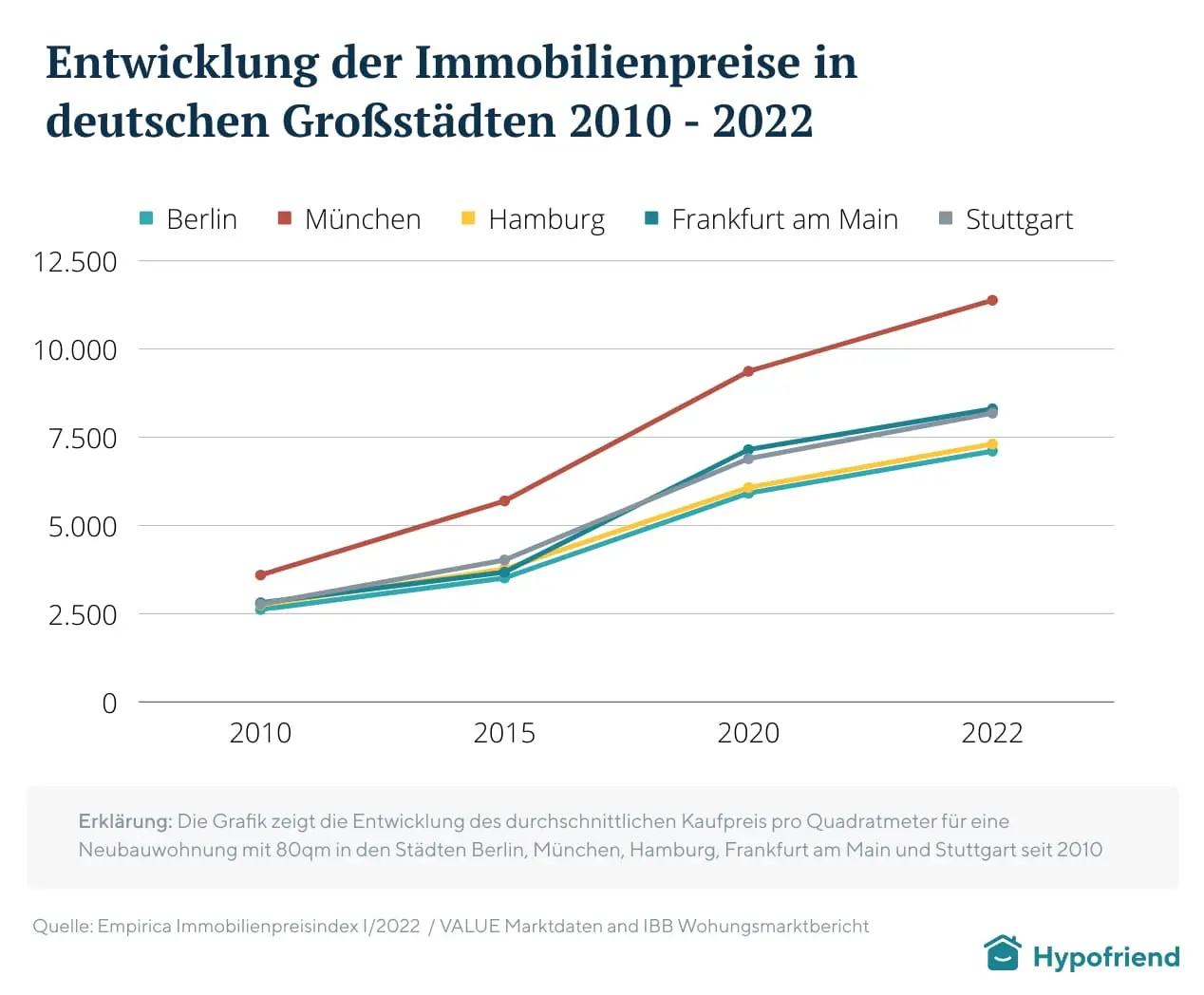 Wir haben das für Berlin, München, Hamburg, Frankfurt am Main und Stuttgart einmal durchgerechnet und dafür die aktuellen Durchschnittsmieten und durchschnittlichen Kaufpreise für eine Wohnung mit 60-80qm, die maximal 10 Jahre alt ist, verwendet.