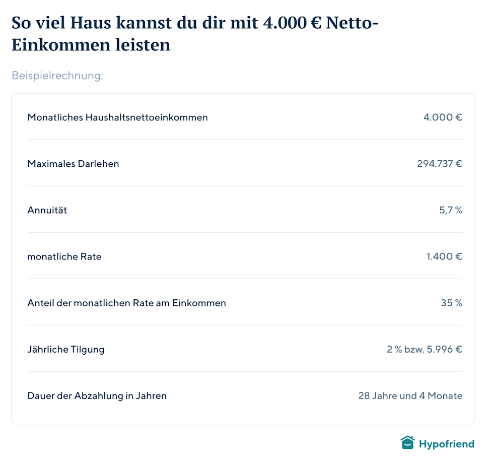 Angenommen, du möchtest gemeinsam mit deinem Partner oder deiner Partnerin eine Immobilie kaufen. Euer Nettogehalt beträgt insgesamt 4.000 €. Weitere Einnahmen habt ihr nicht.